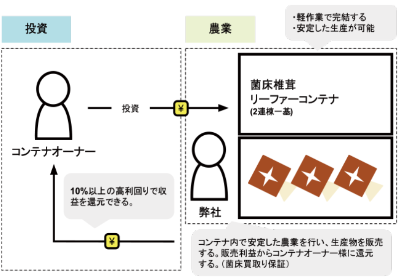 一般的なモデルとしては、栽培したしいたけを販売し、それが収益となっていくのですが、弊社の場合は少し違うスキームを採用しています。